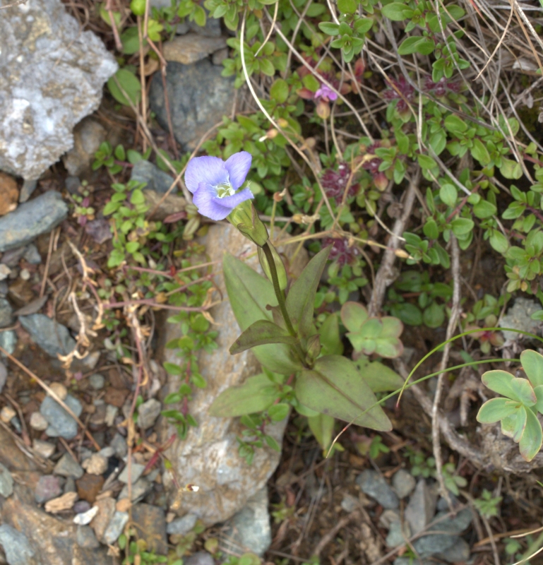 標高3000mほどの日当たりの良い岩稜の礫地に生育していた。長い花柄の先に淡紫色の4個の裂片に分かれた花を咲かしている。
