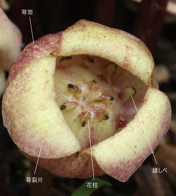 萼裂片は3個、3角形で強く反り返り萼筒に密着する。萼筒内部には縦に低く隆起した襞がある。花柱6個、雄しべ12個。