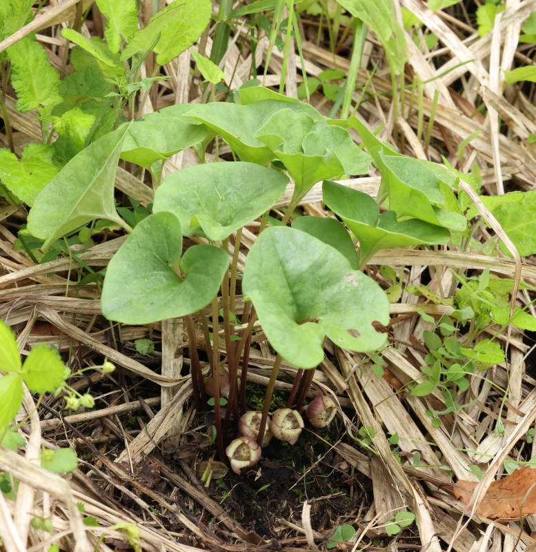 雑感:ウスバサイシン節のウスバサイシンやクロフネサイシンが湿気の多い渓流沿いを好んで生育するのに対して、やや湿った環境ではあるがススキやササが生えるような丘陵地の下部の草原に生育しているのには驚かされた。生育地の範囲は狭いが繁殖力が強いのか、幼苗が多数見られたのはよかったが、あらためて阿蘇外輪山の特異性を再認識するとともに、草原を維持するための山焼きや草刈りなどの必要性を感じた。