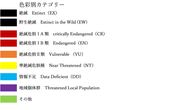 ・ 絶滅(EX)と野生絶滅(EW)は同じ色の黒色、絶滅危惧ⅠA類(CR)と絶滅危惧ⅠB類は同じ色の濃赤色を使い、区別していません。