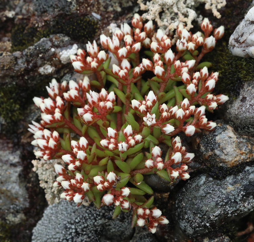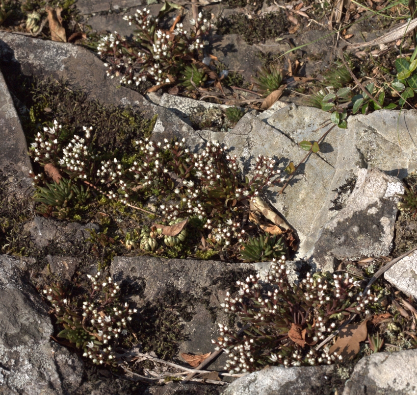 雑感:名前の親であるツメレンゲは本来の崖地から人里の屋根や石垣まで見かける機会も多いが、チャボツメレンゲは西日本の山地の自然度の高い岩上であり、なかなか出会えない。