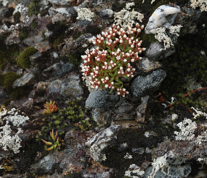 大小の礫が表面に出ており、チャボツメレンゲの開花株とロゼットの幼株が点在し、周辺には銀白色の地衣類と黄緑色のコケ類が見える。