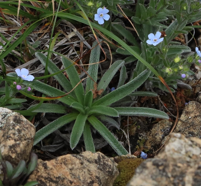 前画像の右下にある根生葉の近接画像。大小16個ほどのほそい線形の葉をロゼット状に広げている。葉全体に1~2㎜ほどの灰白色の粗い毛があり、この毛は同属のミヤマムラサキより長く本種の特徴のひとつである。
