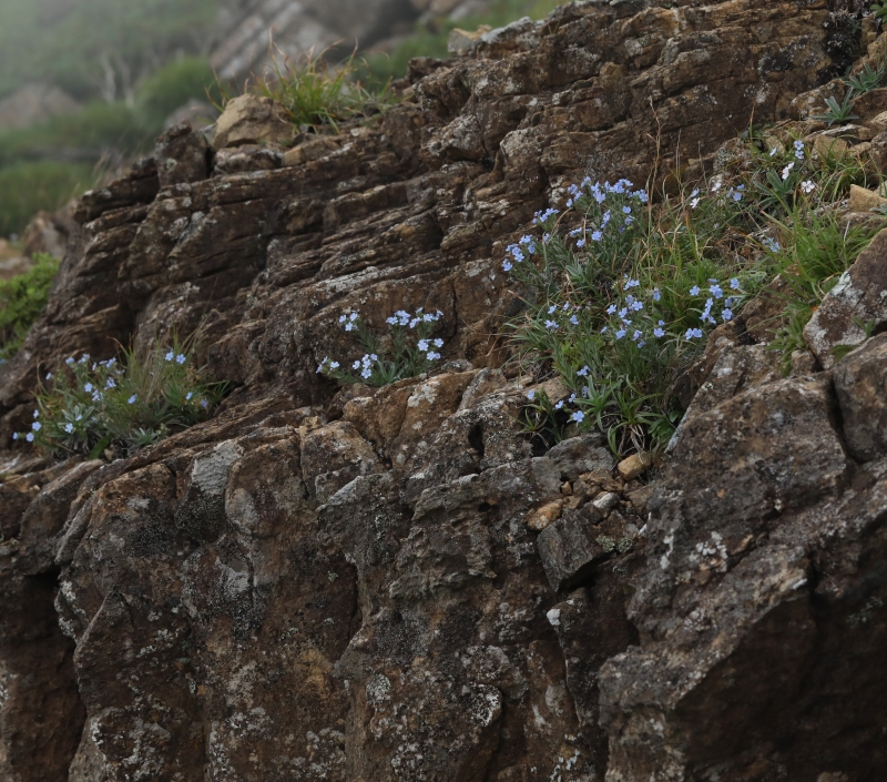 カンラン岩の岩の亀裂に生育している個体。一つの根生葉から7個ほどの茎葉を伸ばしその先に多数の淡青紫色の花をつけている。黒褐色の橄欖岩を背景に淡青紫色の花が浮き出てきれいである。