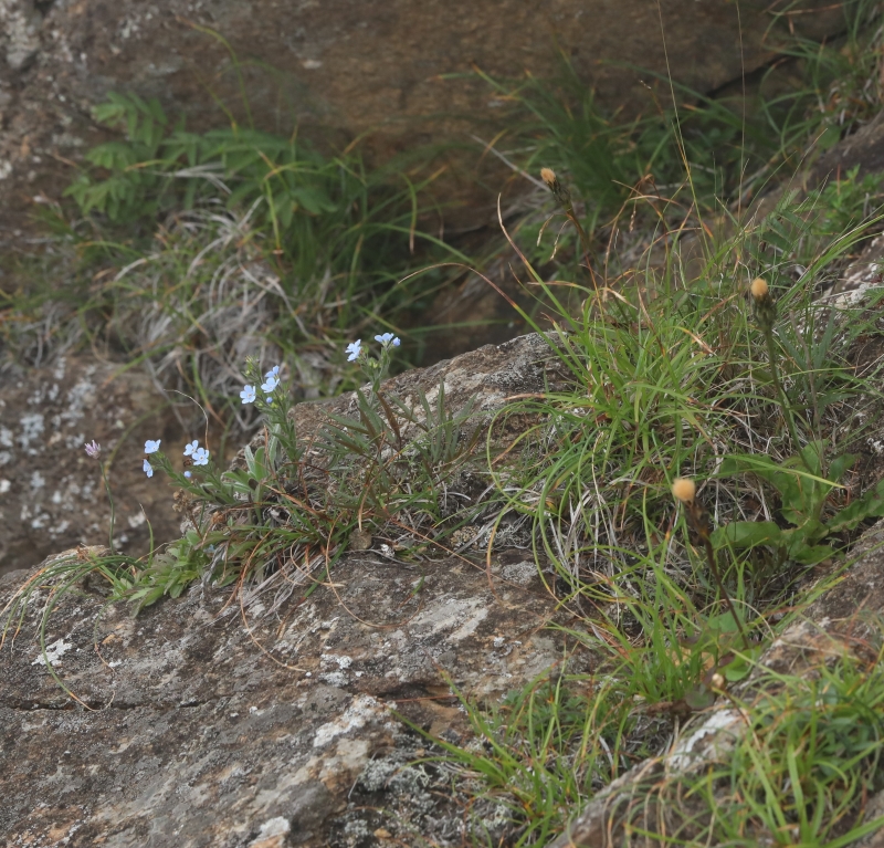中央にエゾルリムラサキ、右側にカヤツリグサ科の植物に混じって花が咲き終わり結実したエゾコウゾリナが3株ほど確認できる。