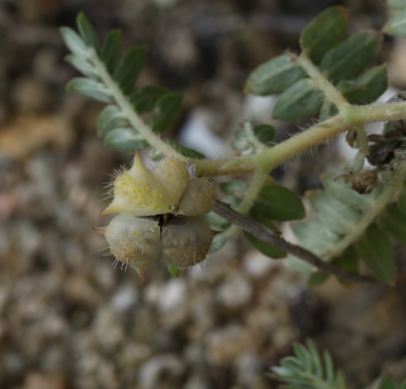 葉は4~7対の偶数羽状複葉で対生し、葉軸は長さ3~6cm。花柄は1~2cmで有毛である。