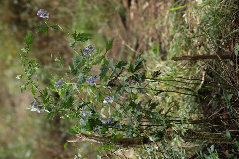 効率よく他の植物に絡み、日光を得るためであろうが、まだ進化の途中なのか、アサガオのようにはまだ巻き付けないようである。トリカブトの仲間は谷間などの少し湿った所に多いが、本種は風通しのよい少し乾燥気味の