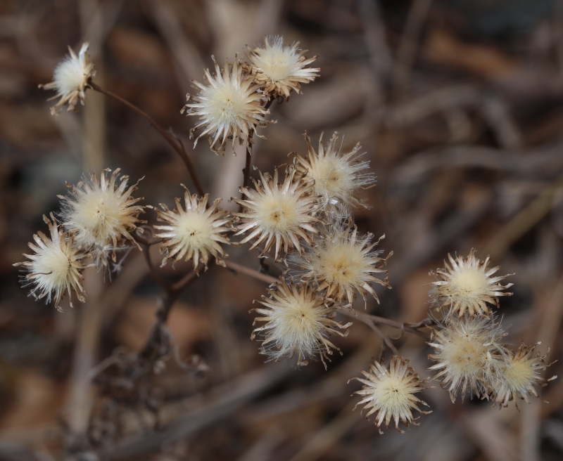 冬季の枯れて成熟した頭花で、冠毛を持った痩果を風で散布しようとしている。