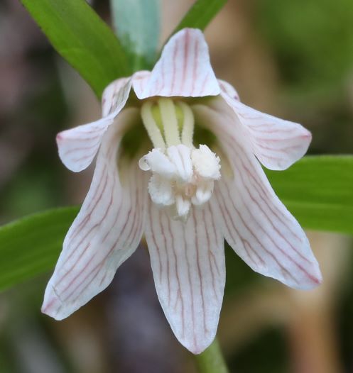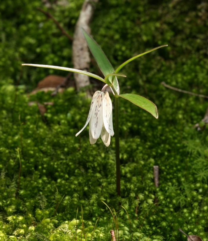 葉は5個で、下部は対生、上部は3輪生。花は細い筒状鐘形で茎先に下向きに1個だけつける。この個体には花被に紫褐色の条線と小さな斑紋が混じっている。