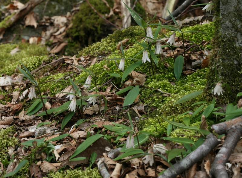 この生育地は原生の落葉広葉樹林の大木がほどよく点在する岩の多い斜面で、沢にも近く適湿な環境で、樹木が葉を落としている春先はよく陽光が差し込む明るい場所であった。