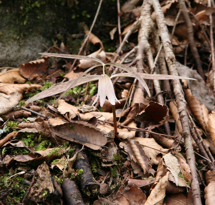 雑感:ホソバナコバイモは分布域も広く、また生育環境も人里近のくから山地まで広く適用しているようにみえる。福岡県の犬ヶ岳の自生地は、自然度が高い落葉広葉樹林帯の春先の陽光の射すなかで、群生状態を観察できたことは印象深かった。