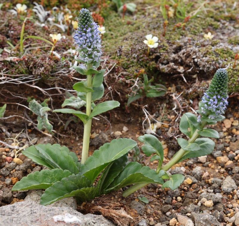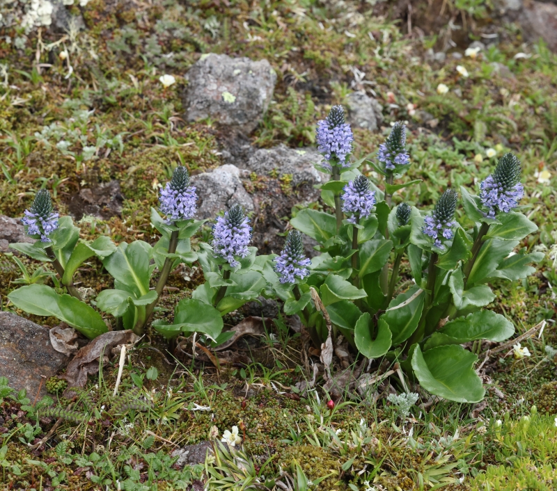 ホソバウルップソウが3株点在しているが、周辺には下方にコマクサ、エゾタカネスミレ、右方にメアカンキンバイ、上方にイワウメが見られる。