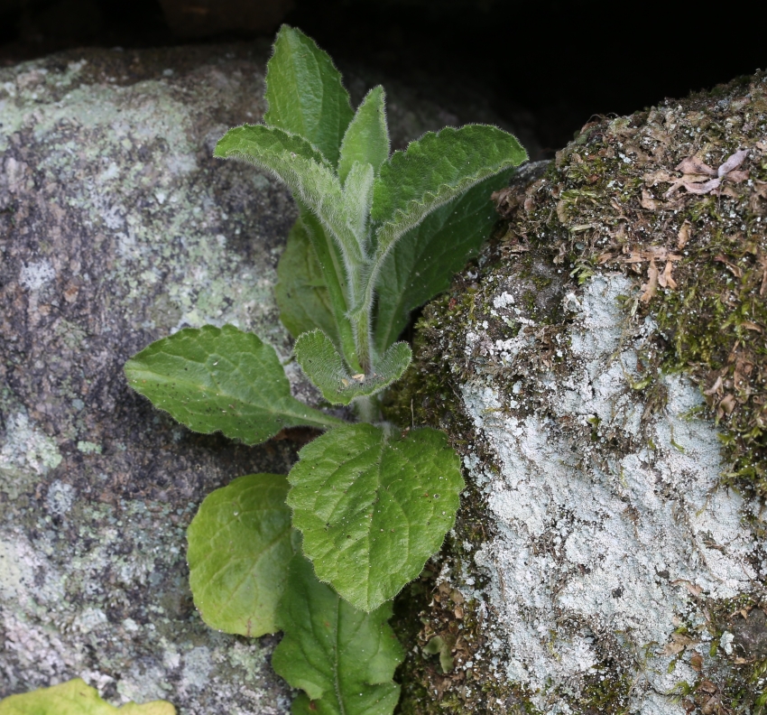 石垣の隙間に生えた個体。葉は下部にロゼット状に集まり、長楕円形で長さ5~13cm、幅1.2~4cm、鈍鋸歯があり葉先は円頭、葉柄には翼がある。中部の葉は倒披針状長楕円形で基部は茎を抱く。