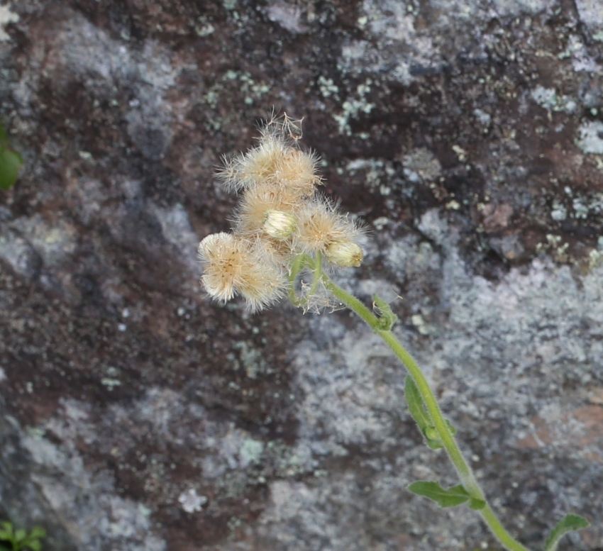 この個体の茎頂は頭状花序とはいえないほど小花が離散しており、小花も未熟なものから、成熟し冠毛が出て結実しているものまでバラバラのようである。
