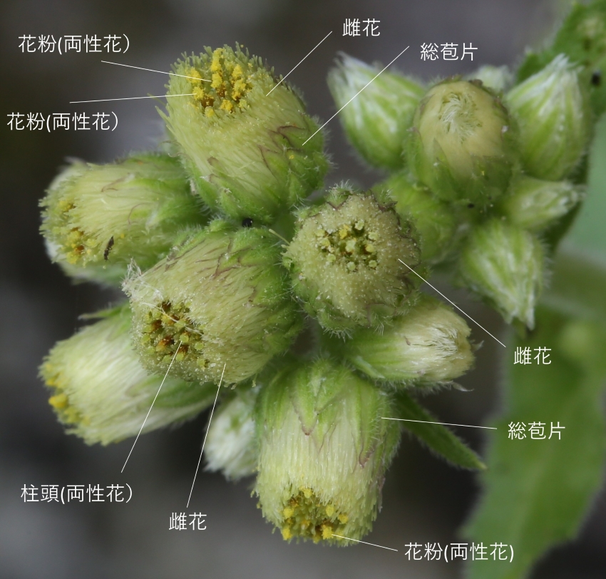 頭花は小花で構成され、小花は中央付近に両性花、周辺は雌花の筒状花であり、舌状花はない。キク科は雄性先熟であり、上部にある小花の中央の両性花の葯から黄色の花粉が押し出されている。