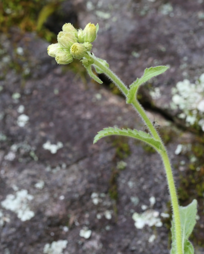 石垣の隙間から茎を伸ばし、茎頂に小さく未熟な頭花の蕾をつけた個体。イズハハコは花期が長いようで、この8月の成熟し冠毛で痩果を飛ばしている個体もあるが、