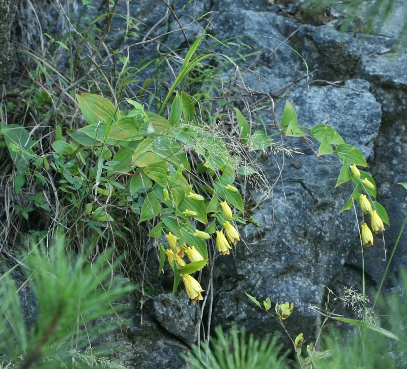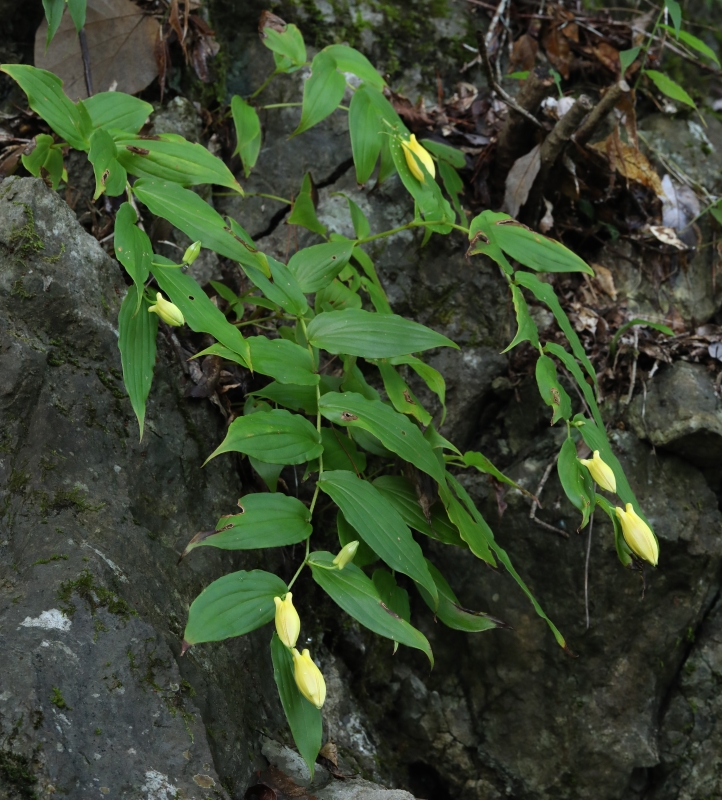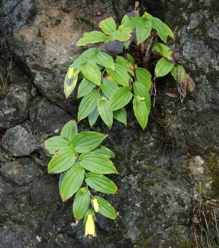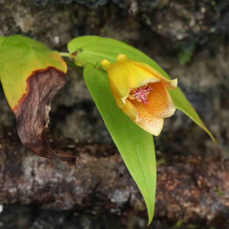 このような環境がジョウロウホトトギスの最適な生育環境のようにみえる。中央から下方にかけての株は岩の隙間に根を下ろしており、乾燥気味のため葉焼けしている。