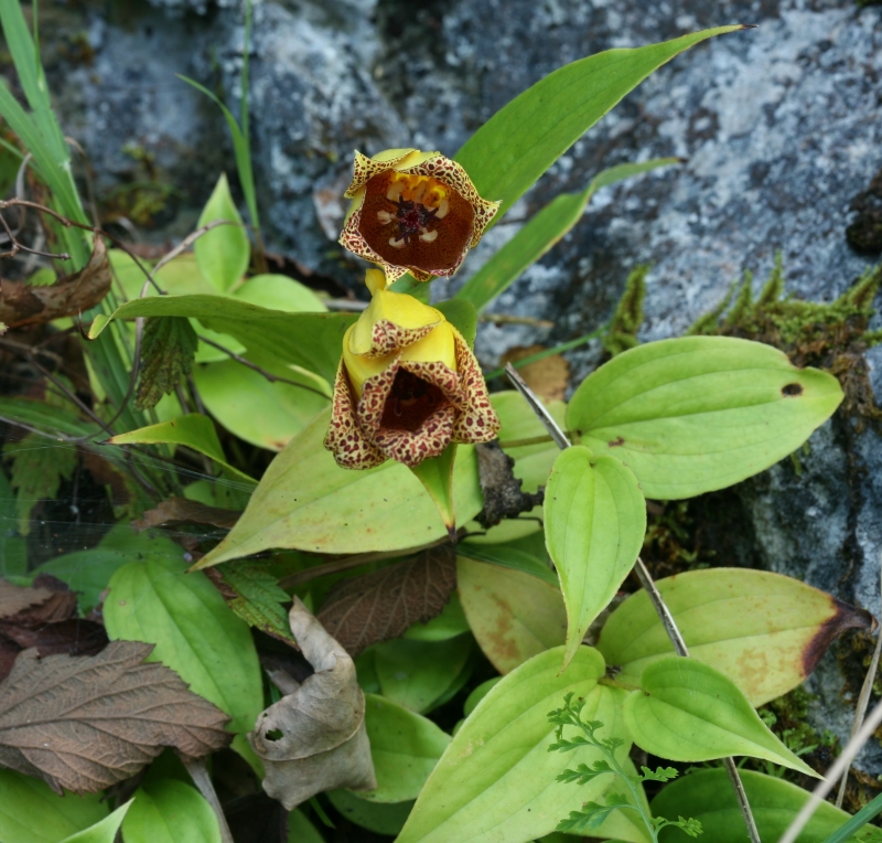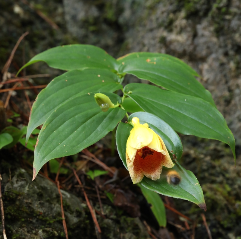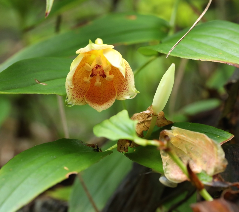 外花被片の基部に突起状の距がみえる。釣り鐘型の明るい黄色で花被の質は厚く光沢があり、花被内面の紫褐色斑点は内面の縁まである。