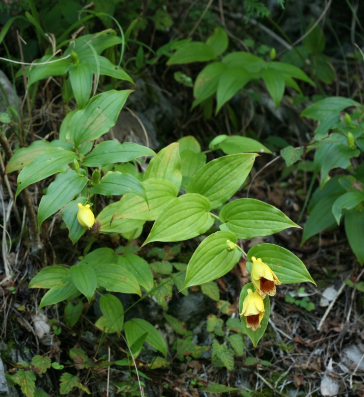 基部は心形で、片側に耳片がある。花は茎の上部の葉腋に下を向いて1個ずつつく。花被片は黄色で、内面に紫褐色の斑点が花被片の先まであり、鐘形で半開し、長楕円形で長さ約4cm。