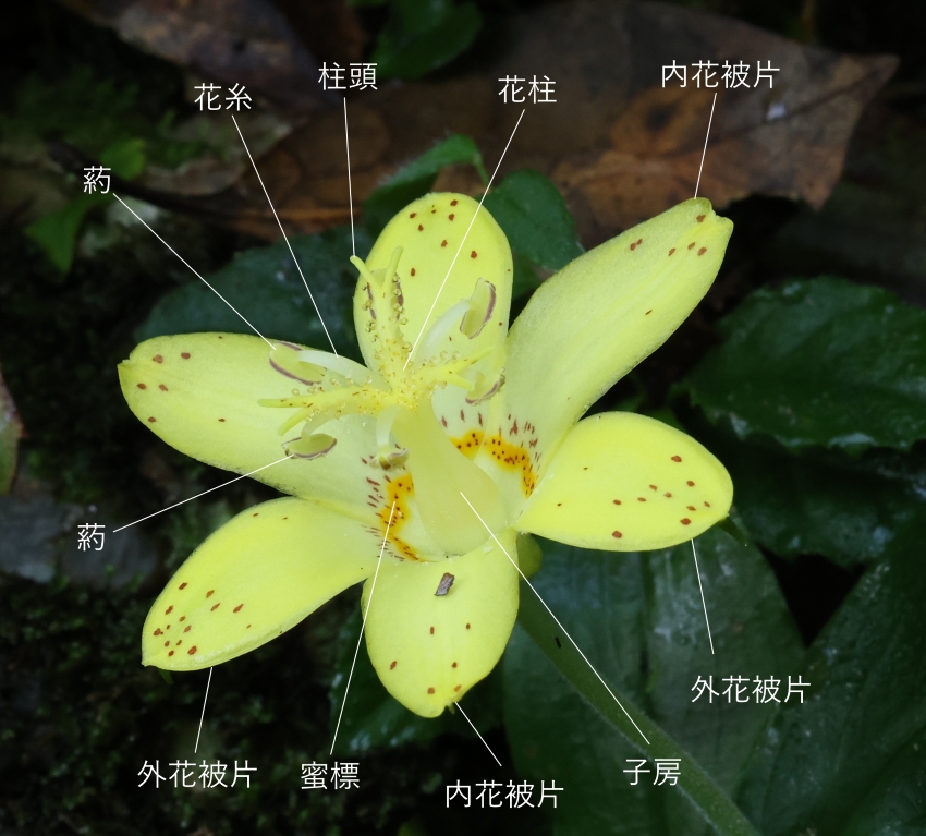 はるかに長く毛が密生する。雄しべは6個、葯は外向きで褐色である。花柱は3枝に分かれ、各枝はさらに2裂し平開する。花被片は6個あり、内外片ともにほとんど同形で、長さ約2.5cm、黄色の地に赤紫色の斑点がある。外花被片の基部に距がある。
