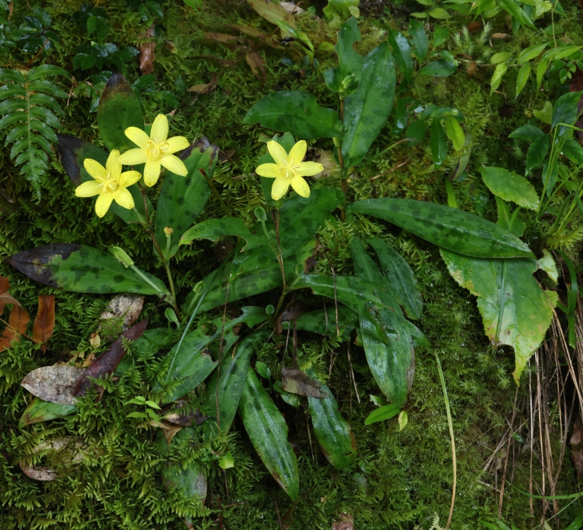 草丈(花茎)約20cmの3株。コケのにおおわれた崖地に根茎を下ろし、開花したばかりの花をつけている。虫による食害で傷んだ葉をつけている個体が多いが、この個体は