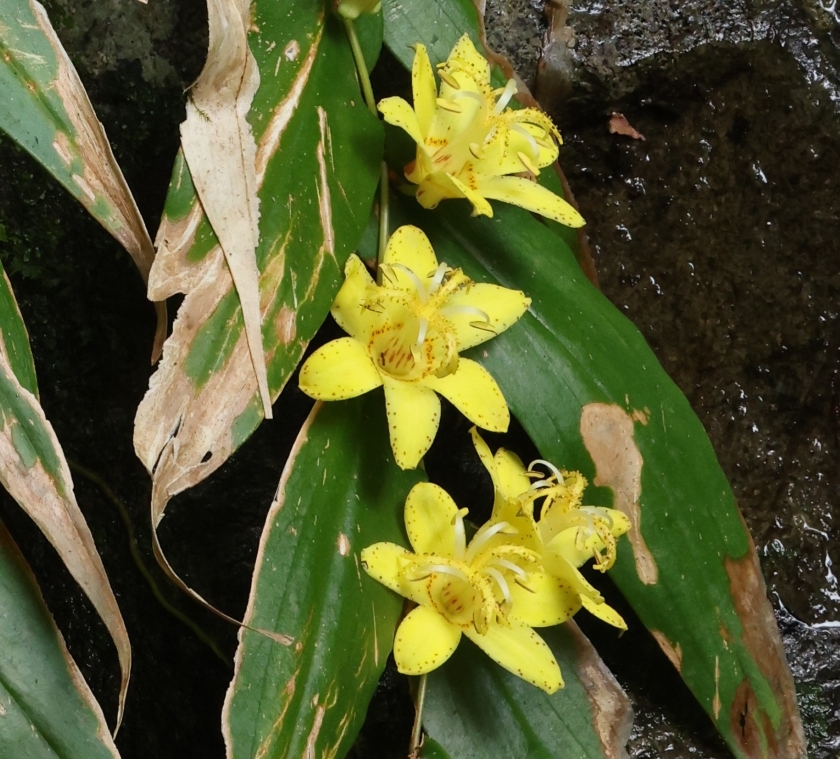 雑感:尾鈴山は非常に硬い岩石である珪長質火成岩類で構成されているため長年の浸食により深い急峻な谷や断崖絶壁をともなう尾鈴山瀑布群とよばれる滝がつくられた。キバナノツキヌキホトトギスは同じ黄色い花を咲かせるキバナノホトトギスやタマガワホトトギスとは大きく形態が異なり、この急峻な谷の湿った崖地の岩場に下垂して自生できるように進化してきた唯一無二のホトトギスの仲間である。そして、渓流沿いの湿った崖地の岩場から下垂して黄色い花をつけた様は幽玄でもある。