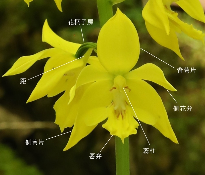 ・特徴 :エビネによく似ているが花は黄色で平開しエビネより大きい。萼片は長さ20~35㎜、幅8~12㎜、側花弁は萼片よりやや小さい。唇弁は深く3裂し中央裂片の上面には3~5条の隆起があり先端はふつうとがる。また、エビネに比べて唇弁の基部の距の長さが5㎜ほどでみじかい。エビネより開花が少し遅く、葉はエビネより大きく長さ40cm、幅9cmほどである。