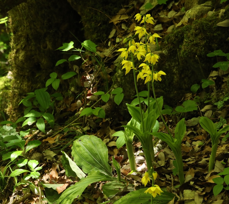 広島県ではキエビネはもともと稀なうえに過去の自生場所も採取され、今知られている自生地も少ない。この場所は石灰岩地の岩場の天然林内でよく採取されずに生き延びていたなと思うほどであった。木漏れ日があたる渓流沿いの岩場で近くにはエビネも自生しており交雑も心配される。