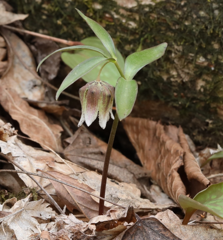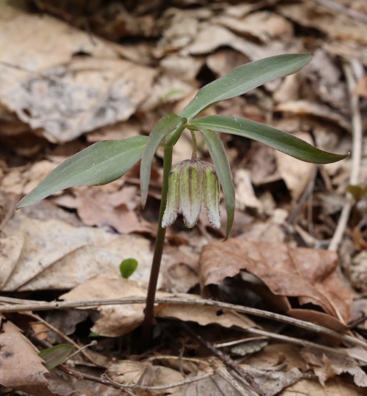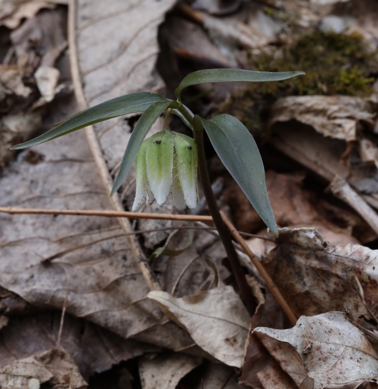 カタクリはまだ蕾であるが、この場所ではコシノコバイモのほうが開花が早いようである。この個体の花被片は淡緑色だけで、紫褐色の斑紋はない。