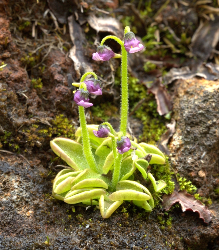 出会いたいと願っていた。現地は確かに霧が多そうな冷涼な岩崖であり、岩肌で栄養価がなく、光合成だけでは小さな草体を維持できずに昆虫食に進化し、さらに繁殖においても花茎を上方に曲げて種子を岩肌につける工夫など