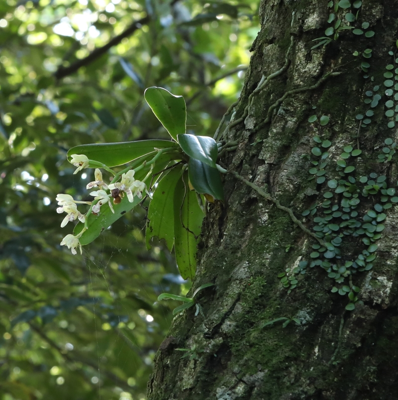 前画像の全体像で、生育環境は谷川沿いの照葉樹の原生林の胸高直径40cmほどのスダジイの地上から約5mほどの樹幹に着生して開花していた。樹幹にはマメヅタの他にナゴランの子株も2個着生していた。