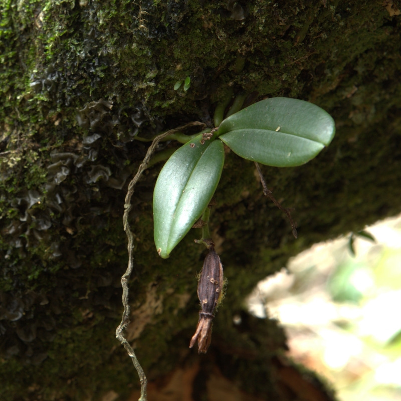 前画像と同じタブの倒木に着生していた個体である。葉が2枚しかない小株であるが、昨年開花して結実した果実が残っている。