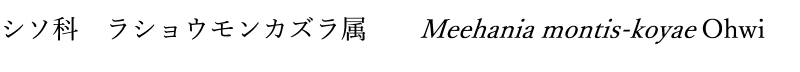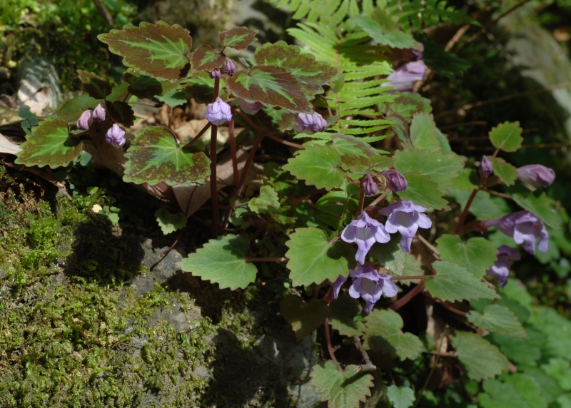 前画像の花の近接画像。花は葉腋につき大きく空いた下唇の喉部には開出毛はみられない。ラショウモンカズラの花よりこじんまりとして上品である。