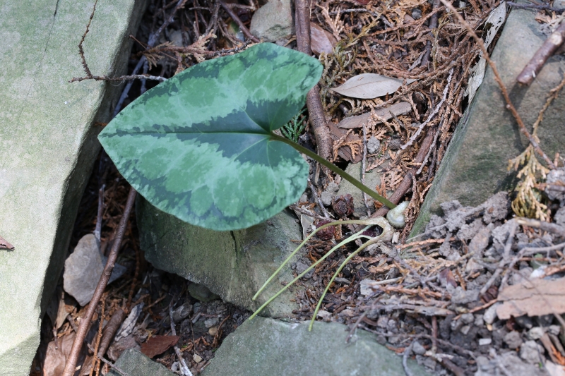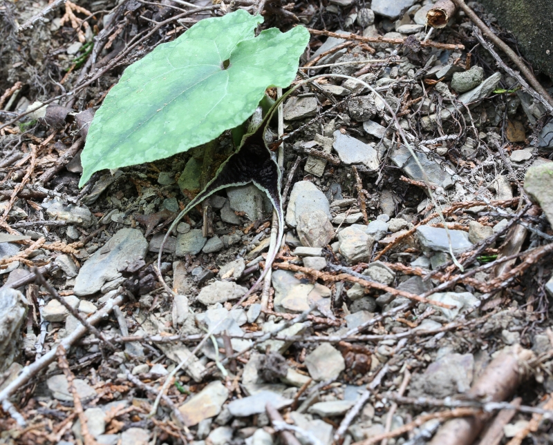 落ち葉が堆積してきて、草丈の低いオナガカンアオイは埋もれそうで生存環境が悪化しているようにみえる。