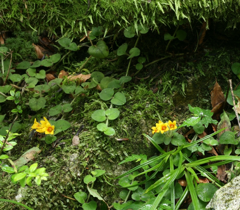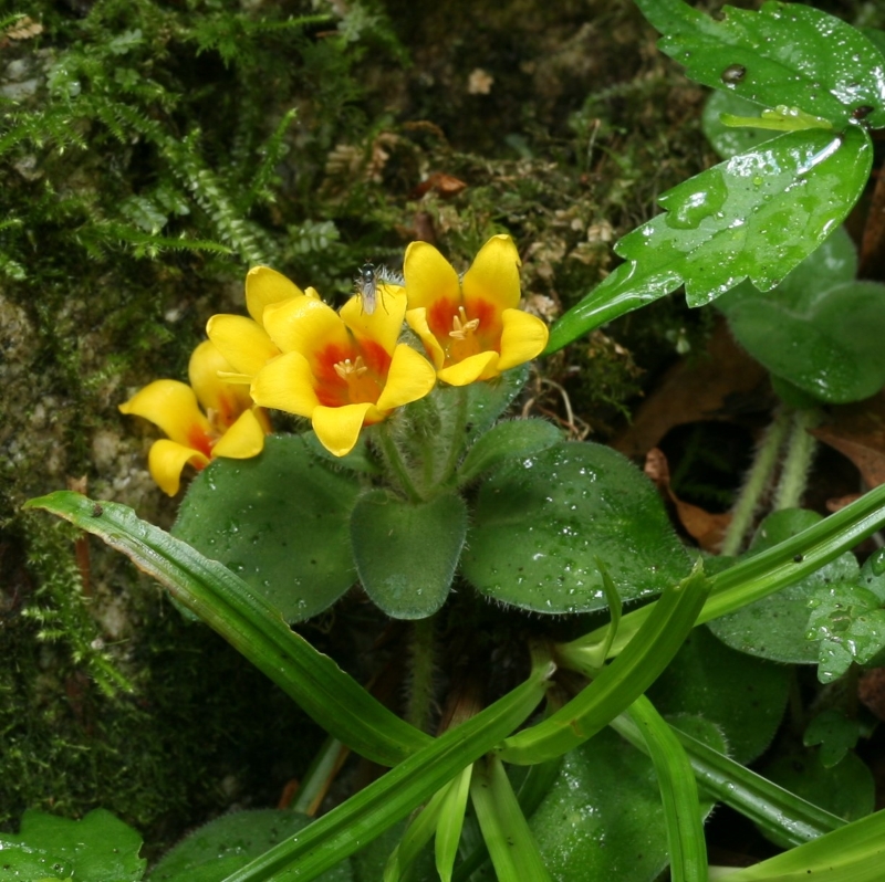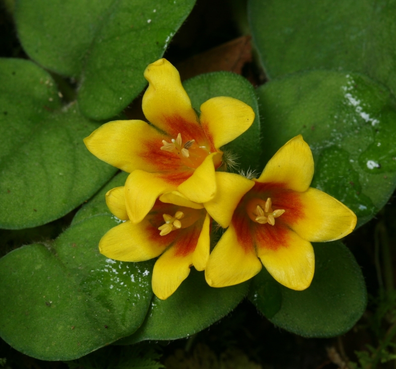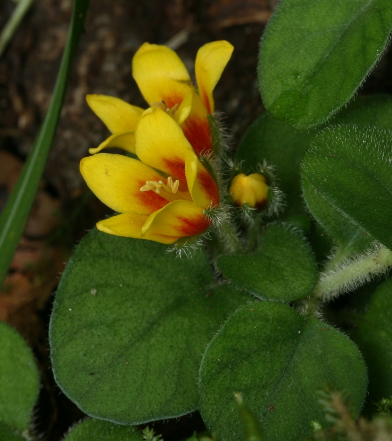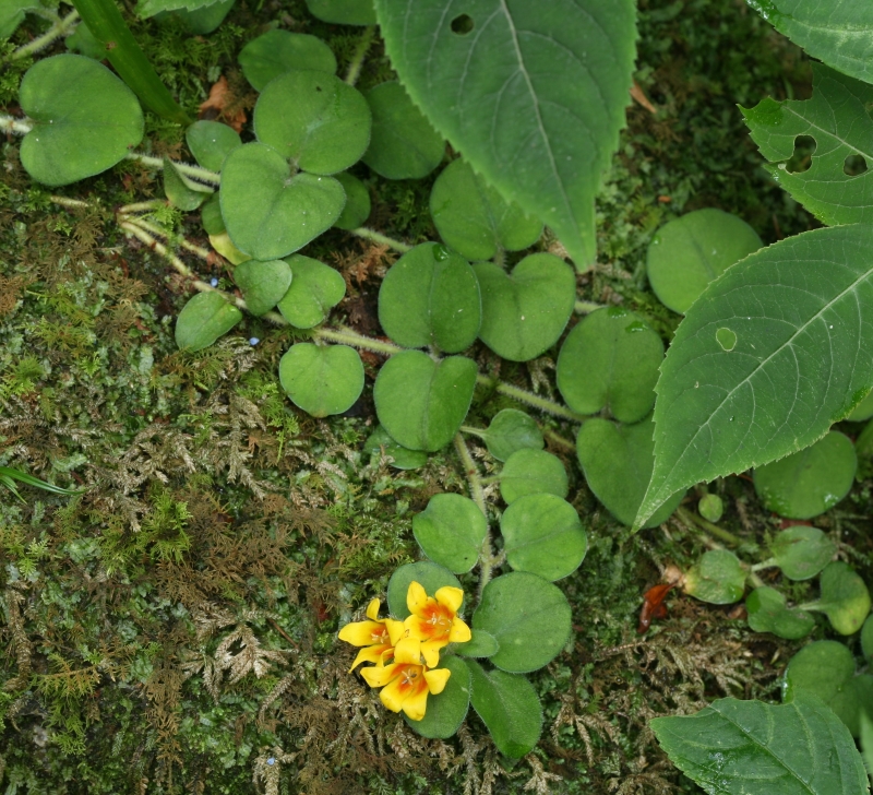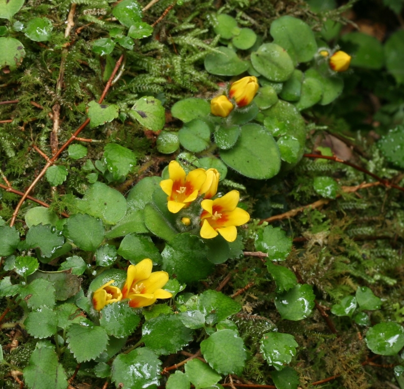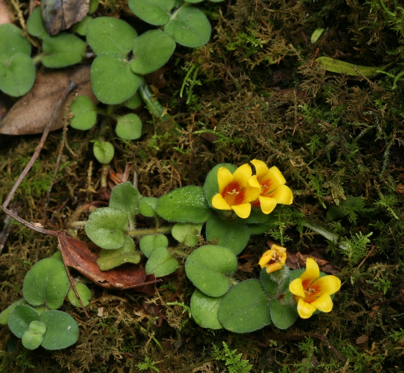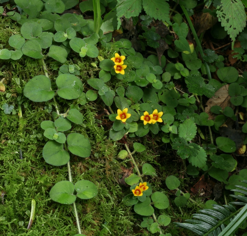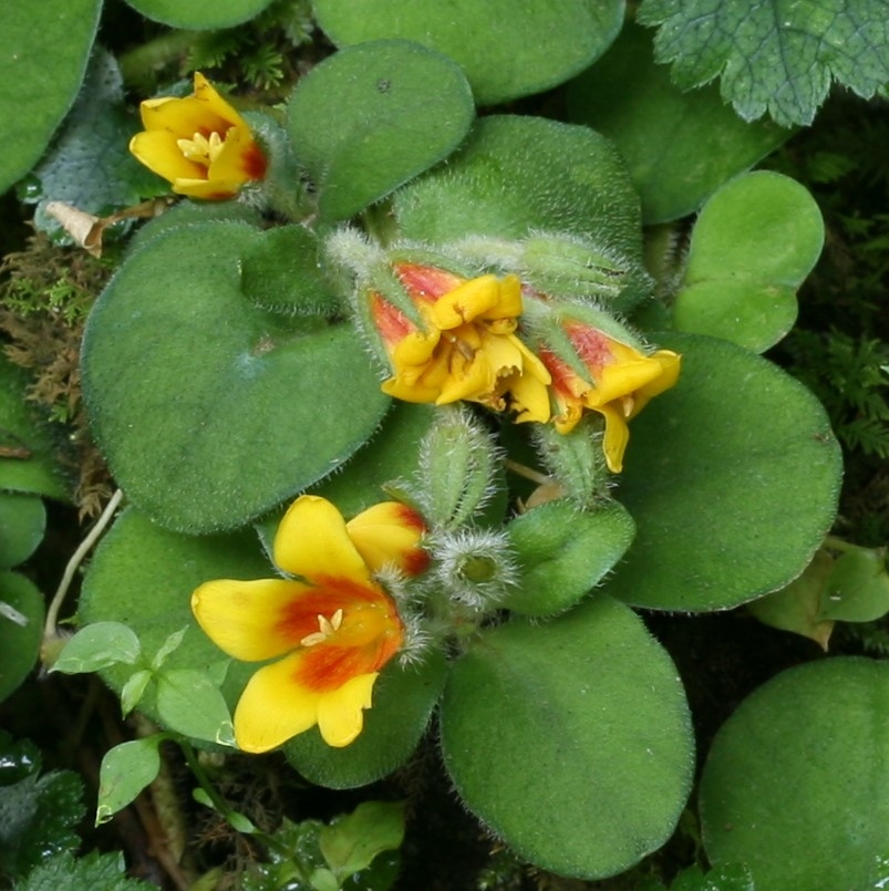 ・特徴 :常緑性の多年草で茎は軟毛が密に生え、地表を匍匐する。葉は対生し長さ2~4cm、幅1.5~3cmの広卵形、先は丸いかやや凹む。花は茎の上部の葉腋に1~4個つける。花冠は濃黄色で中央部は紅褐色を帯び、直径約1.5cmで5裂する。花冠裂片は長楕円形で先は丸い。
