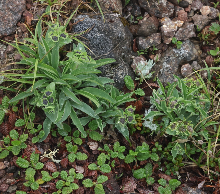 礫地の岩間に根茎を下ろした個体。下方に葉だけのキバナシオガマがみえる。