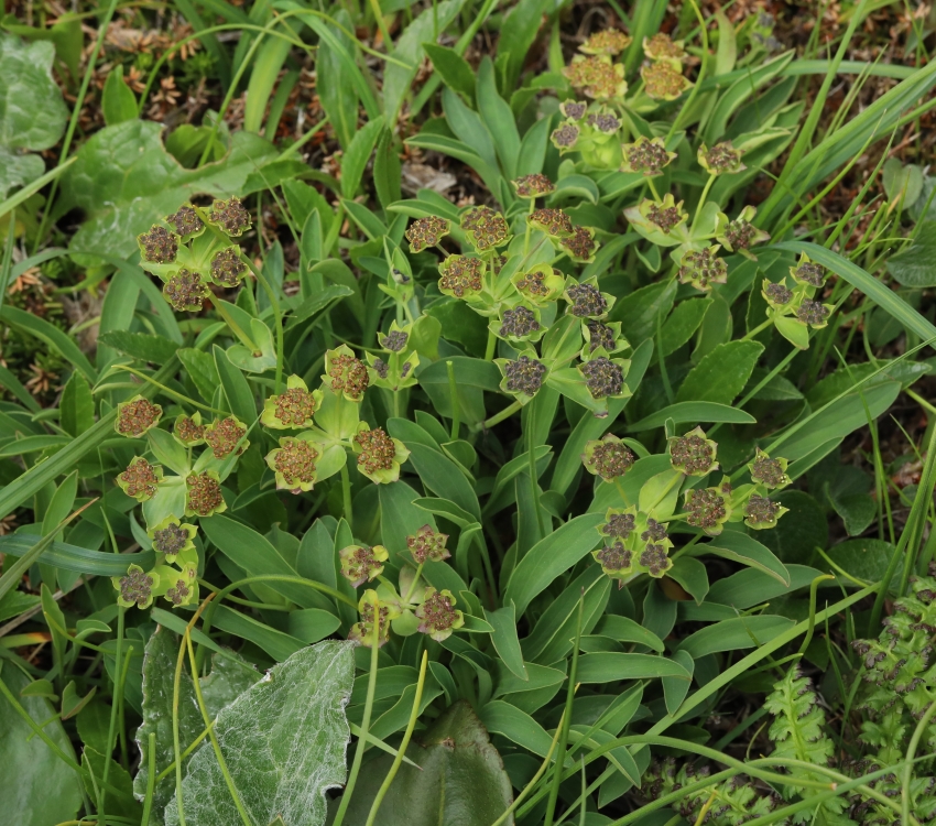10個ほどの花序がある大株。黄褐色~黒紫色の花と濃緑色の葉の組み合わせがユニークでおもしろい。