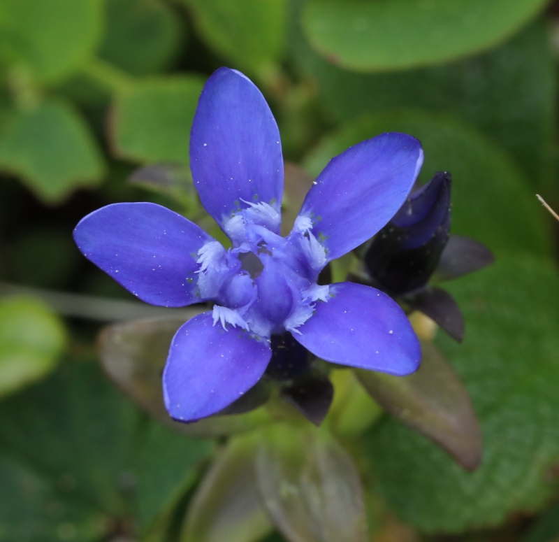 典型的なリシリリンドウの花の拡大画像。花冠の副片が花喉をふさいで花筒内部が見えない。