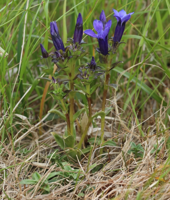 リシリリンドウの花色は青紫~赤紫色と個体によって微妙に異なるが、この個体の花は赤みがかった濃い紫で美しい。根元の右側の緑の葉は来年度に花を咲かせる準備をしているようにみえる。