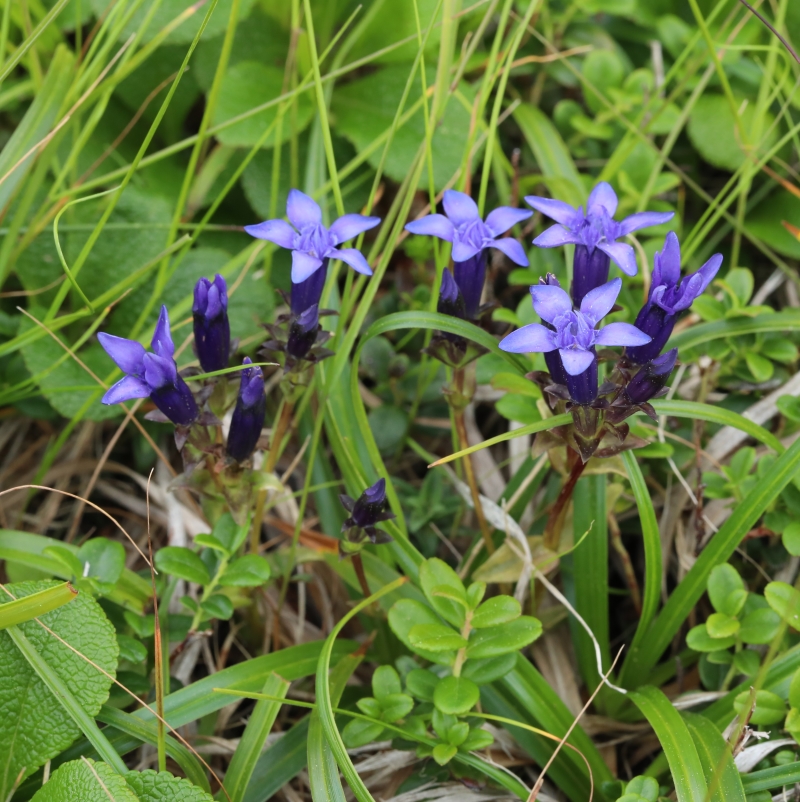 青紫色の花冠と濃紫色の蕾の花筒の対比が魅力的な株。標高1700mほどの平坦な砂礫からなる丘陵地の湿った場所に生育していた。草丈が小さいため、登山道の傍らなどによく見られたが、同じ環境に育つミヤマリンドウとは住み分けているのか区域を分けて生育しているようである。葉は対生、花は5数性。根茎がなく横に這いながら分枝する糸状の細い地下茎がある。