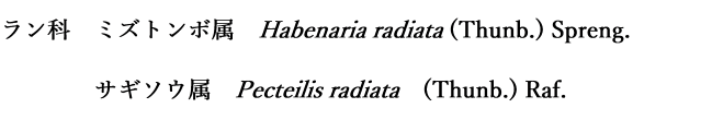 学名のHabenaria(ハベナリア)は「革紐・手綱」、小種名のradiataラディアタは「射出状の」と言う意味で、ホースの先から最初に飛び出す水の瞬間的な飛散の姿にたとえたものか。
