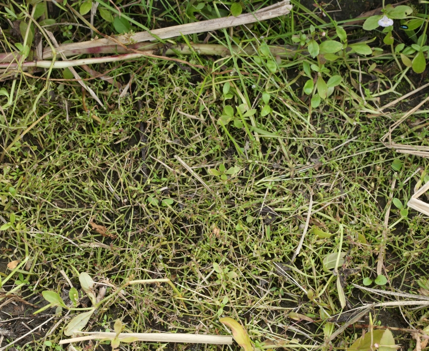 スズメハノハコベから少し離れた水田に同じ環境に生育する1年草のミゾハコベが見られた。大きさや匍匐する様はとてもよく似ている。