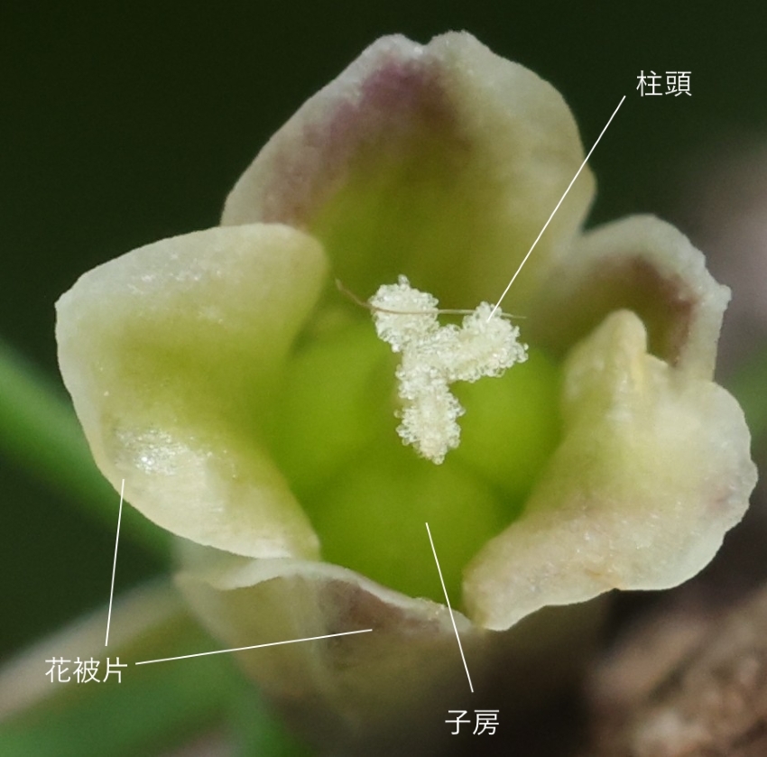 子房は上位で3室、花被片は6個。雄花の花被片は長さ約7mm、雌花の花被片は長さ約4㎜と小さい。