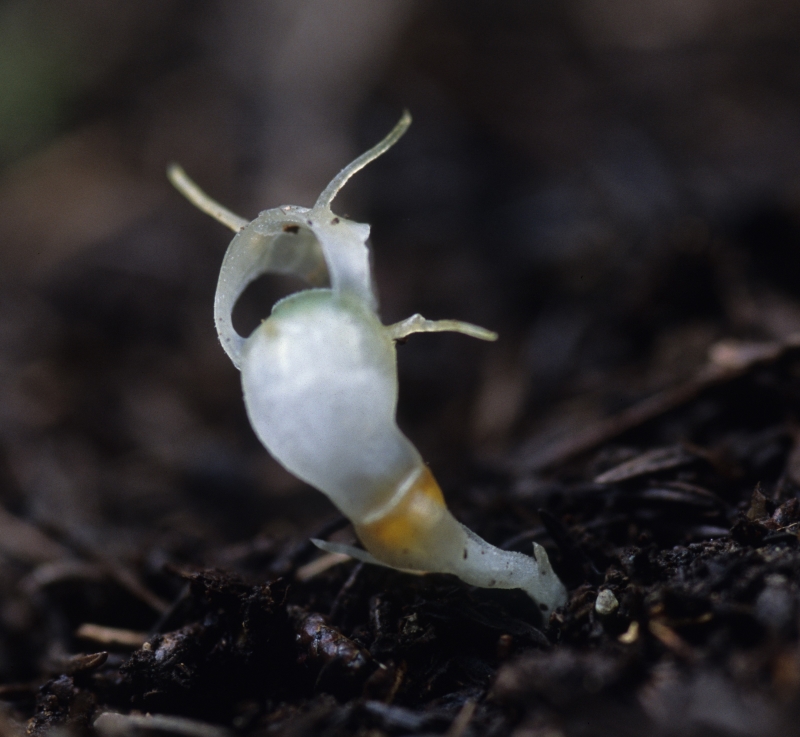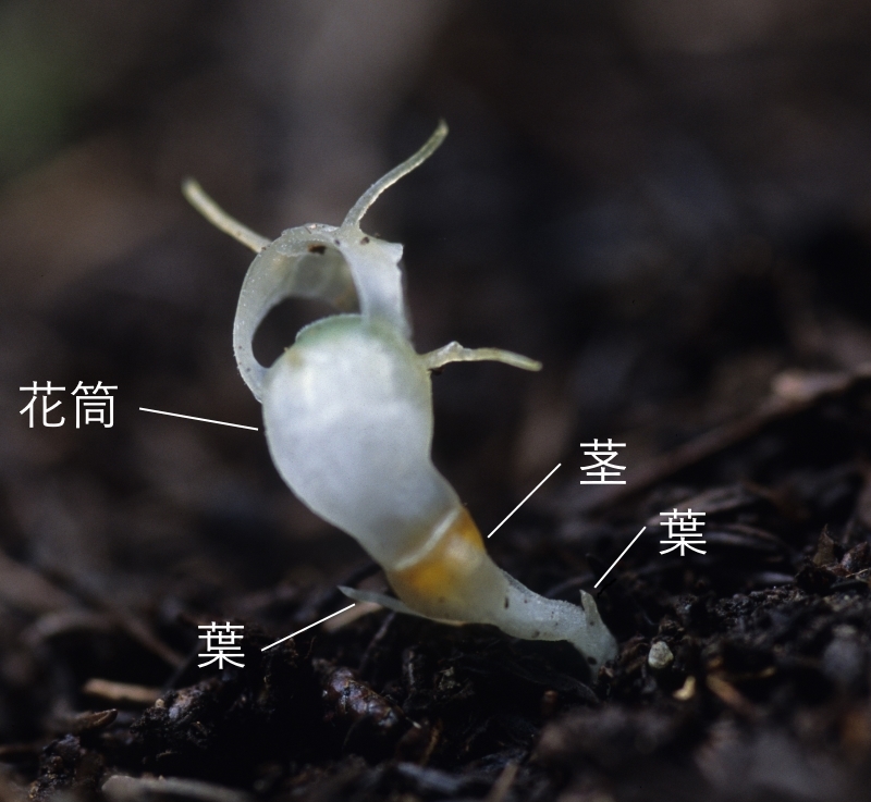 茎に葉緑体のない半透明の白色の葉がわかる。