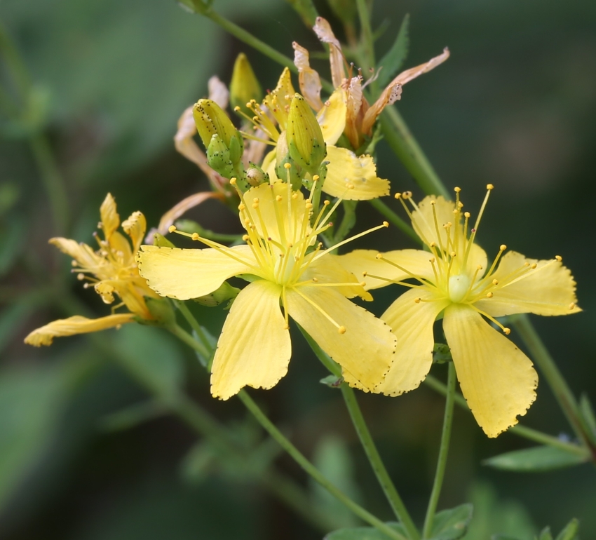 単生した個体の茎頂に咲いた個体。花の径は15~18㎜、花弁は5個、倒卵状楕円形で先端がトモエソウのように曲がり辺縁は波状縁となり黒点がある。雄しべの先の葯の黒点がよくわかる。