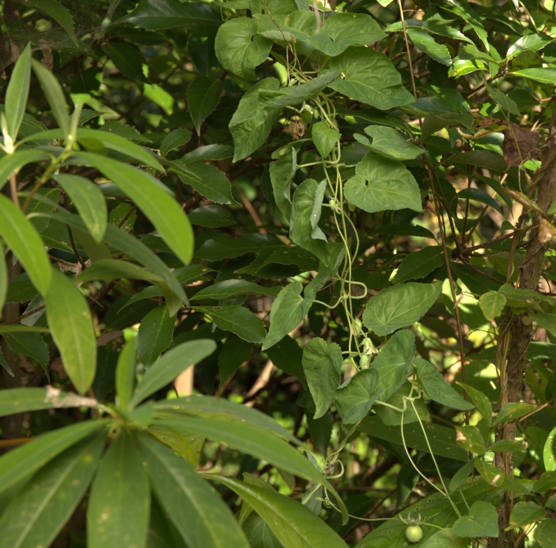 左側の大きな長い葉はミミズバイで、奥のアラカシの枝に絡まりながら茎を伸ばしている。花は葉陰に隠れて見えないが、下方に未熟な淡緑色の果実が1個みえる。