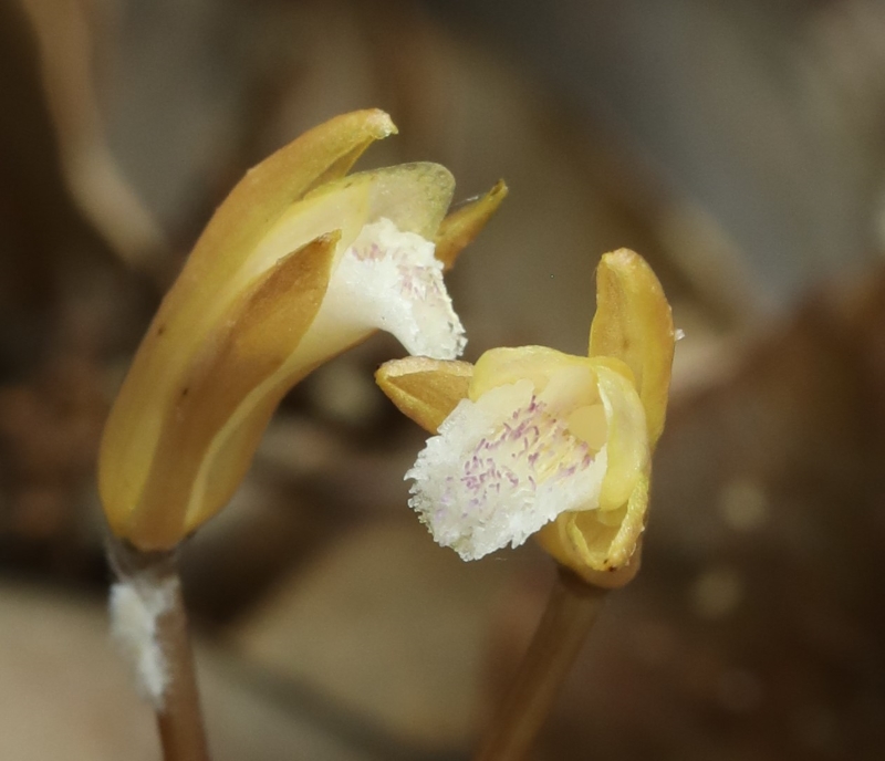 黄褐色の茎には3~4個の長さ4~6㎜の鱗片葉互生する。花は茎の上部に2~6個付き、淡黄褐色の筒状で半開する。萼片、側花弁は倒披針形で約15㎜、唇弁は白色で長さ約12㎜で3裂する。唇弁の中裂片の内側には淡紫色の