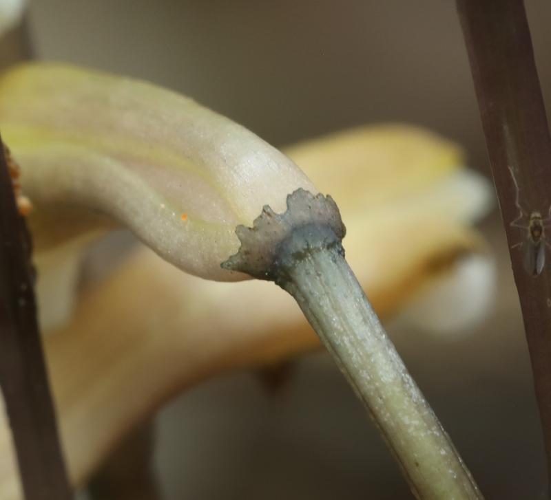 自生地の環境はシイ類の古木の林床であるが、菌類のキノコが好むようなやや明るく通風と湿気も適度にある場所であった。