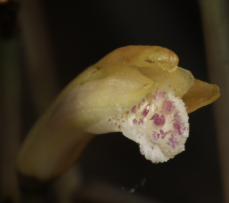 淡黄褐色の筒状の花の長さは15㎜ほどで、水平方向を向いている。3個体ともに先端部が半開し、この花の大きな特徴である唇弁の淡紫色の毛状突起が分かる。