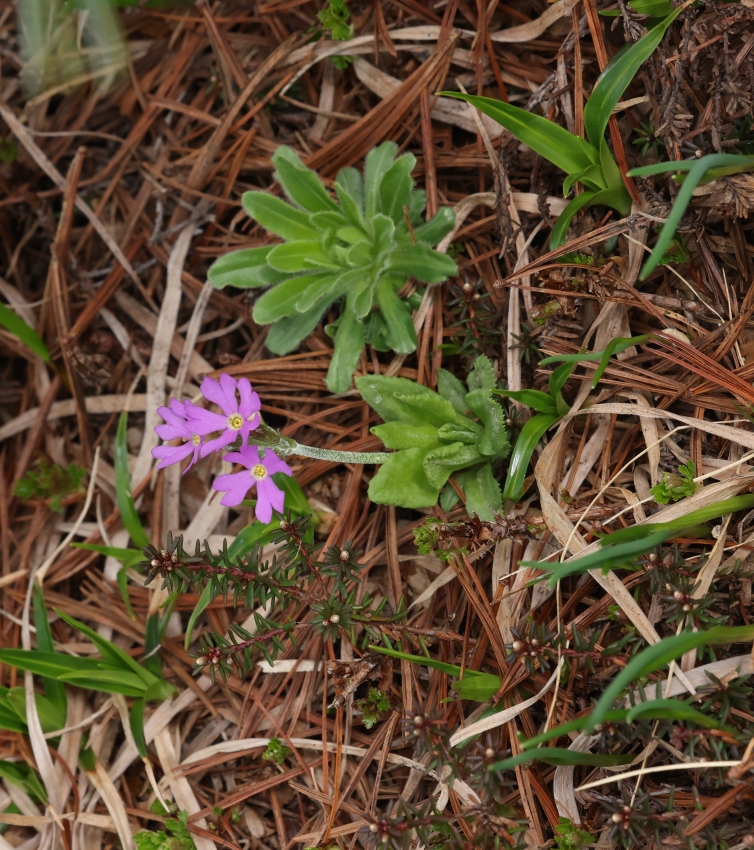 花茎の高さ約10cm、2個の花茎ともに8個ほどの花をつけ、通常の1~4個より多いが、この個体も葉、花茎、花などユウバリコザクラの特徴を持っている。